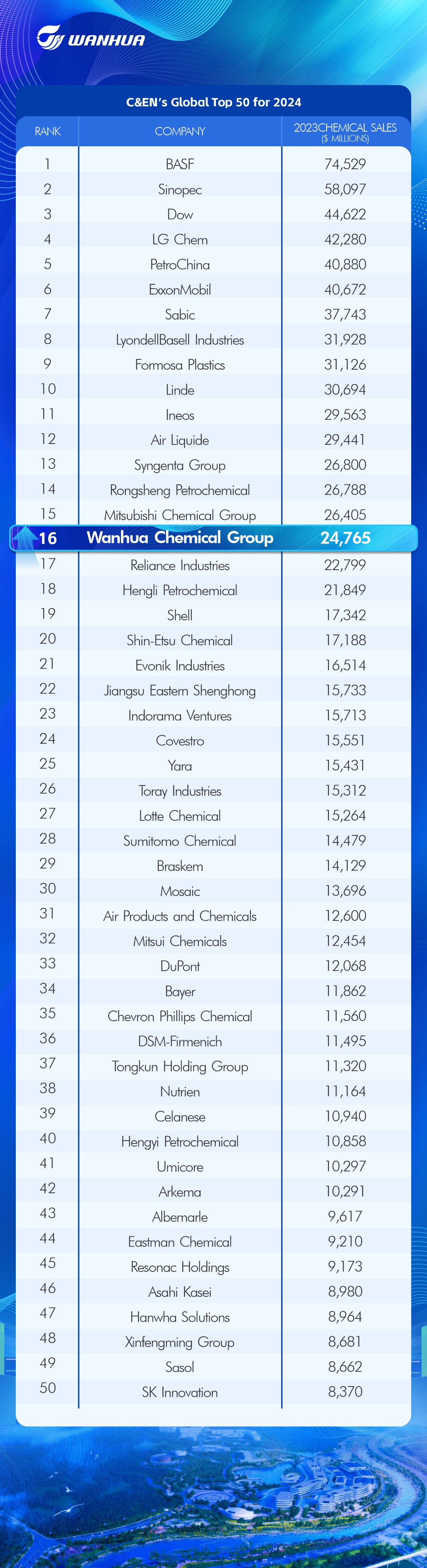 近日,C&EN发布最新世界化工企业50强排行榜(Top 50 Chemical Companies),对全球范围内主要化工企业进行了排名,成人论坛 位列第16位,较去年上升2位。