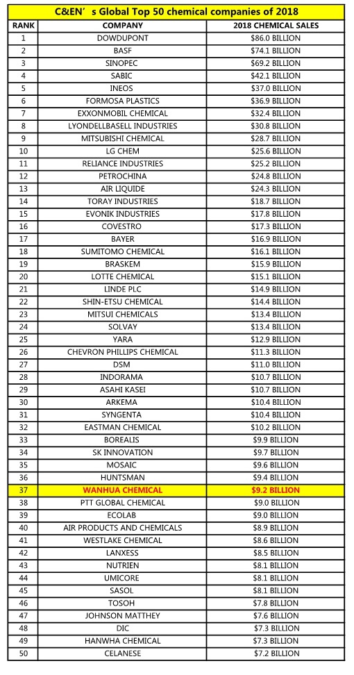 7月29日,美国C&EN(《化学与工程新闻》)杂志公布了2018年全球化工50强排行榜单(GlobalTop50)。成人论坛 以606亿人民币(约92亿美元)再次进入榜单,位居37位,销售额较2017年增加14.11%。