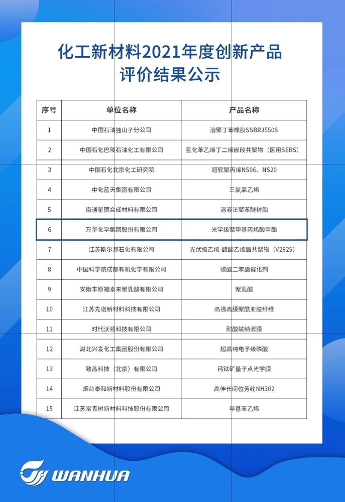 近期,成人论坛 光学级聚甲基丙烯酸甲酯(PMMA)产品荣获中国石油和化学工业联合会公布 的化工新材料2021年度创新产品奖项。