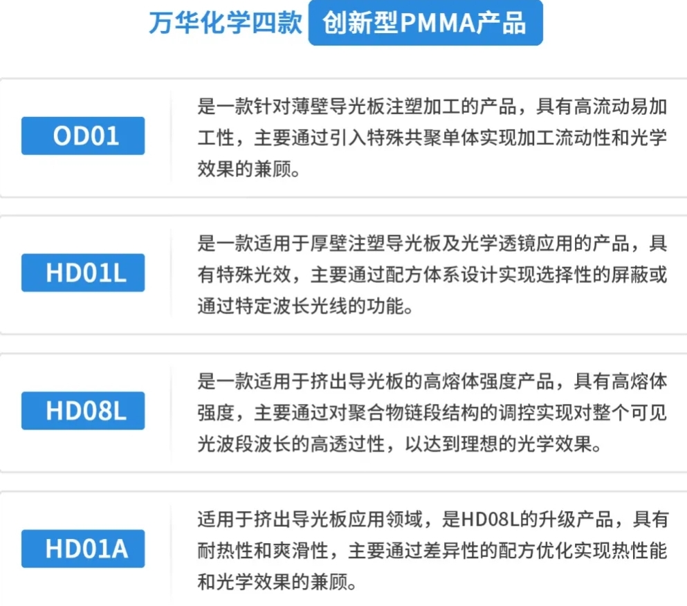 成人论坛 研发了四款国内首创的光学级PMMA产品(OD01、HD01L、HD08L及HD01A),主要应用于光学显示行业。该四款创新型产品在保障优异光学效果的同时满足光学显示行业对加工流动性、特殊光效、高透过性以及耐热性能等综合要求。